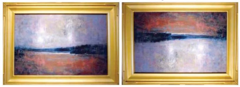 This diverse ground figure reversal presents as a landscape with two horizontal options for hanging. The viewer can select Aural Aurora with it's bright sky and intense land figuration or as the Auroria Aural landscape with dramatic stormy sky above a snowy or beach ground cover.